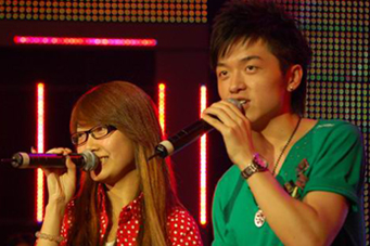我系05届毕业生廖少俊(右一)参加2006绝对唱响成为"人气王"
