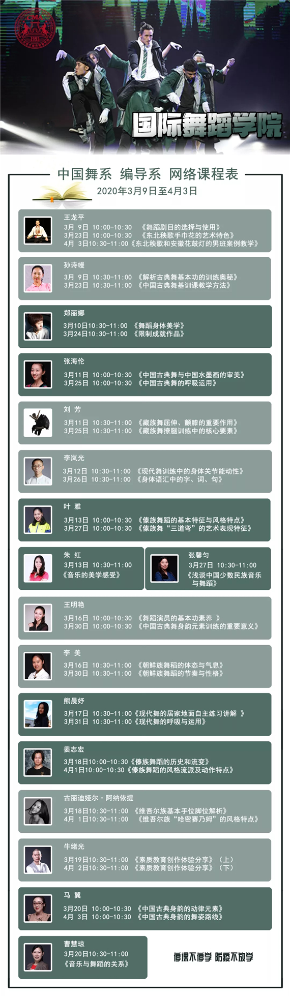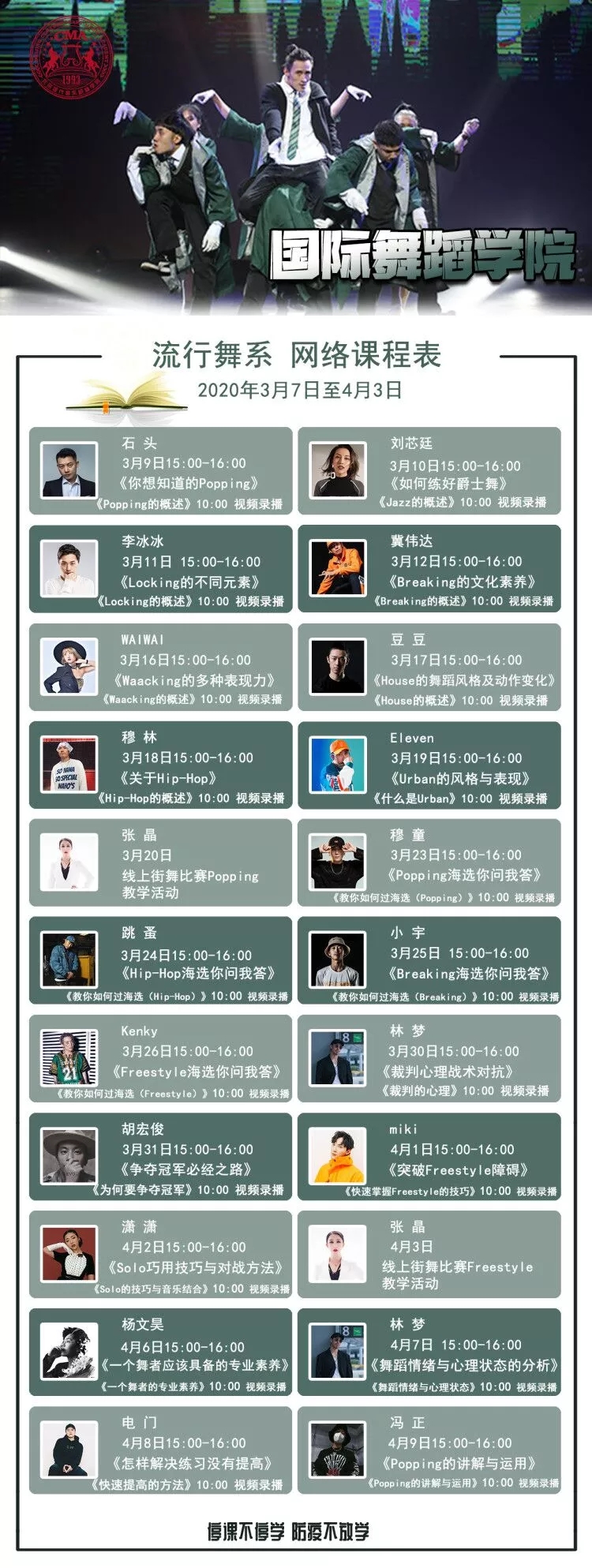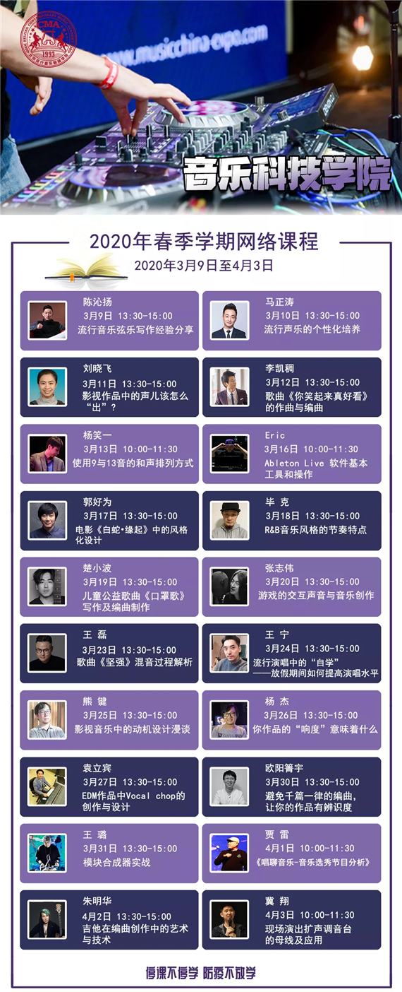 在北京现代音乐研修学院流行舞系最新公布的网络课程表中能够看到,石头、跳蚤、杨文昊等二十余位“大神”前来授课,被网传为“街舞界的半壁江山都来了!”“这课表太专业了!”“这网课,爱了爱了。”“这是什么神奇的课呀,太酷了”等等话语刷屏了朋友圈。各个学院的网课很多都是开播即满员的状态,而音乐科技学院的第一堂网课《流行音乐弦乐写作经验分享》在B站一开播,便吸引了1.5万学员前来上课。