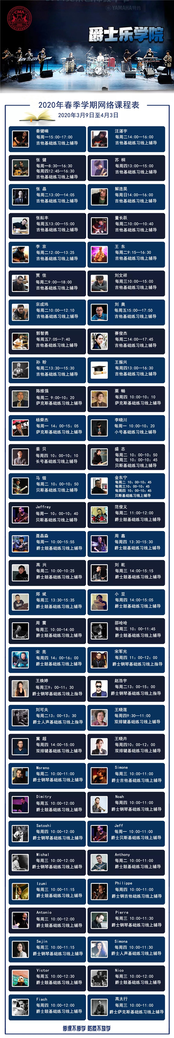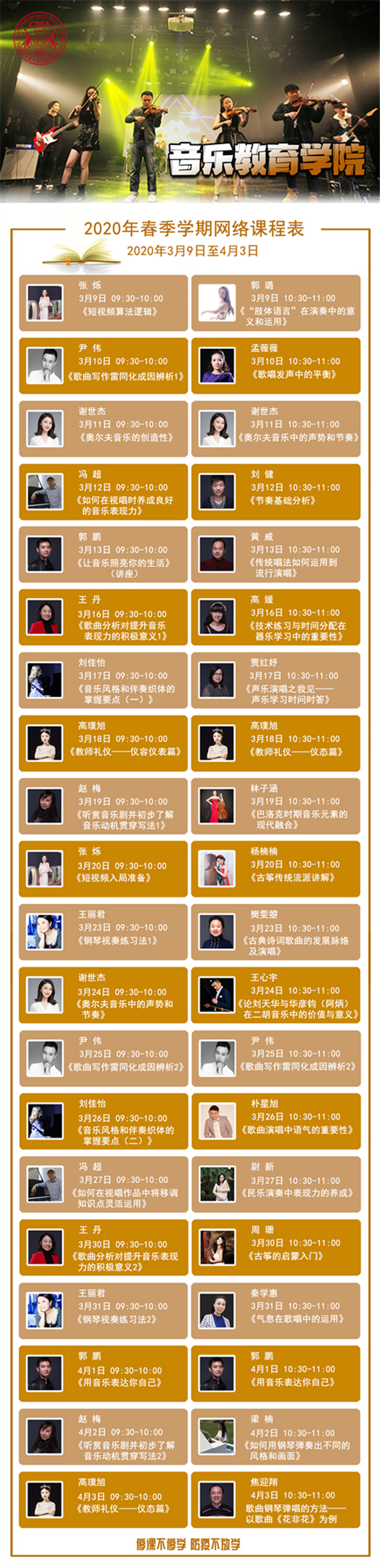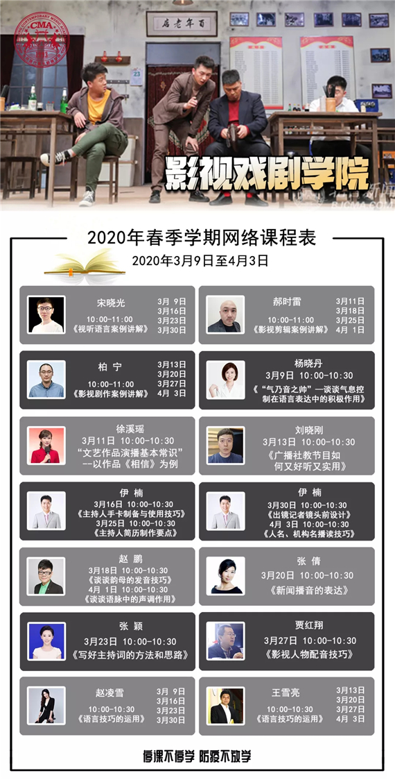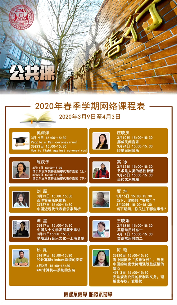 2020年伊始,突如其来的新型冠状病毒让我们措手不及,全国各地高校返校时间延期,为贯彻国家关于疫情防控工作重要精神,落实市教委防疫工作要求,遵循“停课不停学 学习不延误”的原则,北京现代音乐研修学院及北音附中(北京市现代音乐学校)积极部署、高效行动,制定丰富的海量“云课程”教学计划,大学6大个专业学科50个专业培养方向,附中九大教学部,第一阶段的635节课(大学339节,附中296门次),于2020年3月9日正式开启网络授课。迄今开课一周,反响热烈,线上教学、线上交流互动,已成为全校师生每天期待的必修课。