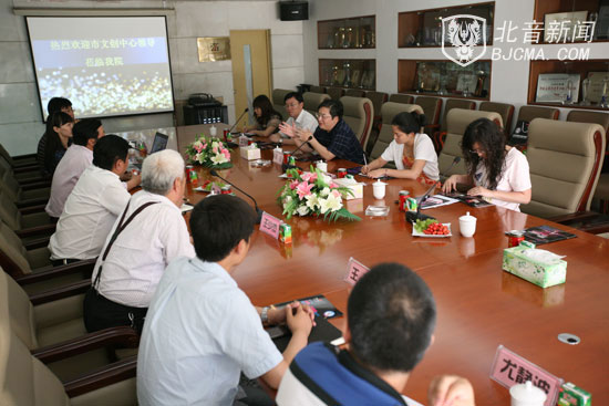 座谈会上,李罡院长向北京市文化创意产业中心的领导们介绍了北京九棵树地区的音乐产业集聚现象以及“2010北京九棵树数字音乐文化节暨首届‘中国联通’数字音乐及多媒体产品交易会”的举办情况;北音品牌文化中心主任汤晓丹则详细阐述了本届文化节的目的、宗旨、主题活动及流程。梅松主任高度肯定了北音在流行音乐教育方面所作出的贡献,针对本次活动的具体细节给予了指导性的意见,并表示会全力支持本次活动。