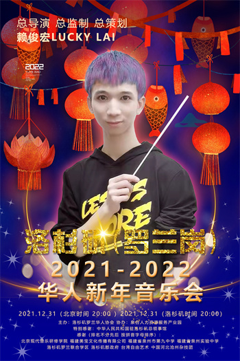 12月31日晚,北京现代音乐研修学院学子赖俊宏担任总导演、总策划、总撰稿的“洛杉矶(罗兰岗)2021-2022华人新年音乐会”在B站精彩播出,北音播音系学子王韬、于佳慧、张天悦担任晚会主持,北音学子康志超担任现场导演,孙郡邦、张朱江担任晚会摄影工作。
