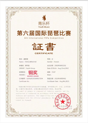 唐明慧,北京现代音乐研修学院音乐教育学院2022级器乐系琵琶专业学生、湖南省株洲市音乐协会会员,曾荣获“青乐杯”第四届中日国际琵琶比赛银奖、“青乐杯”第五届国际琵琶比赛铜奖、2019昭君杯优秀奖;曾参加T3出行长沙宣传片拍摄、爱玛电动车移动合作宣传视频拍摄、统一青梅“穿越宋朝毕个业”长沙分区线下演出、东方Preject手游合作视频拍摄、《玉兔呈祥 迎接2023》活动拍摄、2023年全国消费促进月暨京津冀消费季拍摄等,2023年,参加“青乐杯”第六届国际琵琶大赛青年组铜奖。