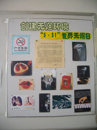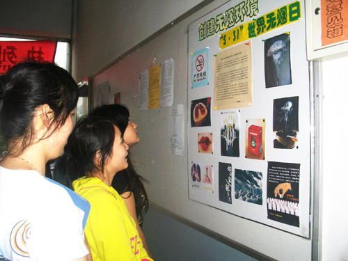 为进一步提高全院师生对吸烟危害的认识,营造无烟、清洁、健康的工作、学习环境和公共环境,院团委利用板报、条幅等形式,在全院师生中开展了关于5月31日世界第二十个“世界无烟日”的宣传与教育活动。很多同学在看了吸烟有害健康的图片展后,感慨很大,他们都说:“吸烟的肺太可怕了,我以后不能再抽烟了!”