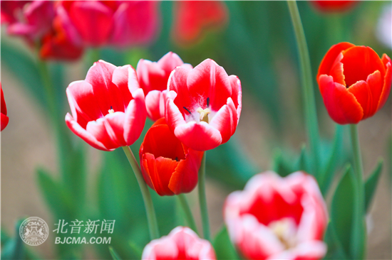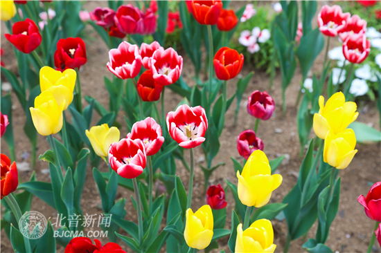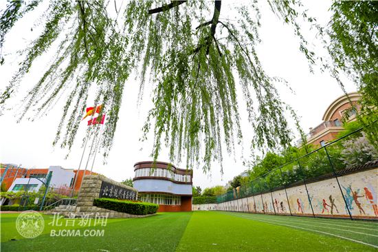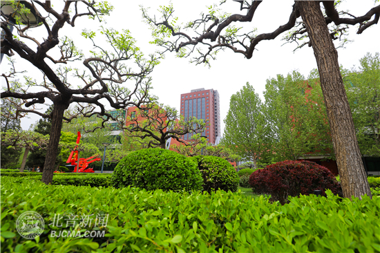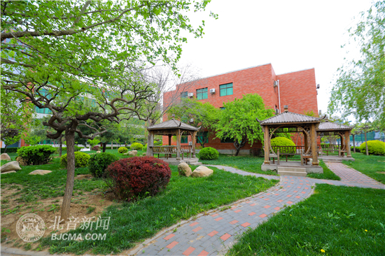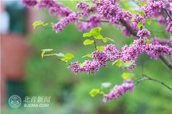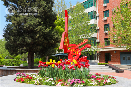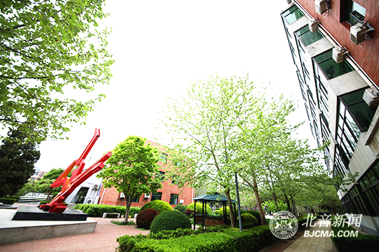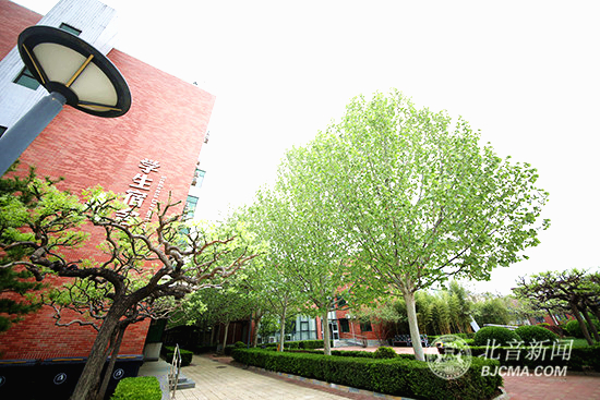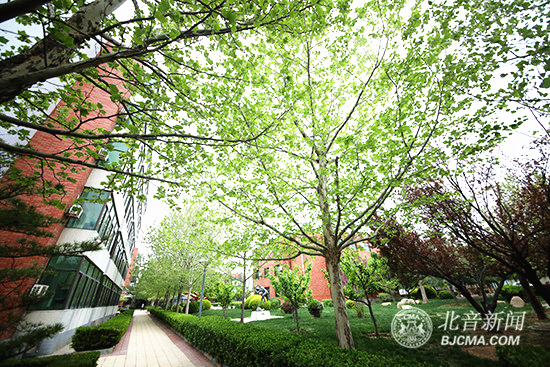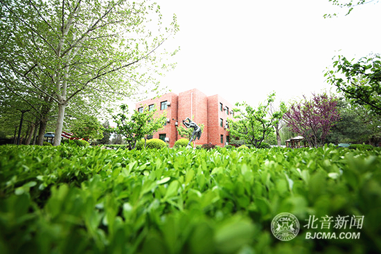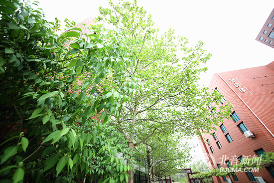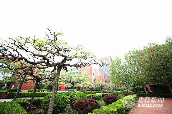 晚春时节的北音校园里,百般红紫斗着芳菲,满庭春颜惹人回眸。太阳升起,淡红色的,镶嵌着金边儿,是温暖而热烈的金白。琴房楼,教学楼,宿舍楼,图书馆……醒目的北音红掩映在郁郁青翠之间,是一种令人想念的大气唯美。