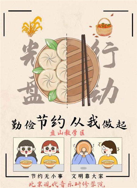 本次“光盘行动,没有休止符”活动,旨在让大家更为深入了解食物的来之不易,珍惜日常生活中的每一粒粮食,杜绝浪费。作为社会人才输出基地的艺术院校,校园风气对社会影响深远,创建节约型高校是构建节约型社会的重要组成部分。根据教育部《教育系统“制止餐饮浪费培养节约习惯”行动方案》文件精神,北京现代音乐研修学院积极开展杜绝舌尖浪费,推进“光盘行动,没有休止符”宣传教育专项活动,从现在做起,从生活习惯开始,从细微处做起,从节约粮食做起,争做节约粮食的传播者、实践者和示范者,向社会展现北音学子的社会责任感和担当认知。