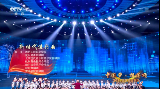 10月1日晚,中央广播电视总台《中国梦·祖国颂——2022国庆特别节目》在央视综合频道和央视频、央视网以及文艺之声等多平台播出,北京现代音乐研修学院音乐教育学院、流行演唱学院学子组成的“北音现代之声合唱团”携手众多高校共同唱响《新时代进行曲》,展示亿万中华儿女向伟大复兴梦想迈进的壮丽征程。