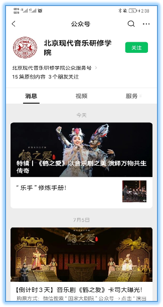第一步:打开微信,搜索“北京现代音乐研修学院”微信公众号,点击关注。