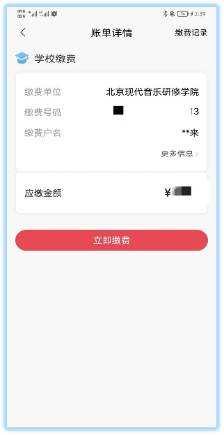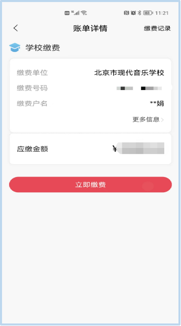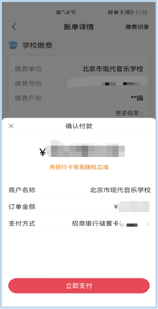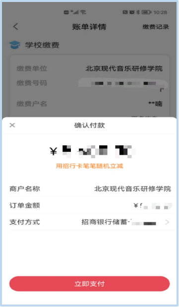 通过招商银行APP绑定银行卡后,即可通过北京现代音乐研修学院/北音附中微信公众号进行缴费。