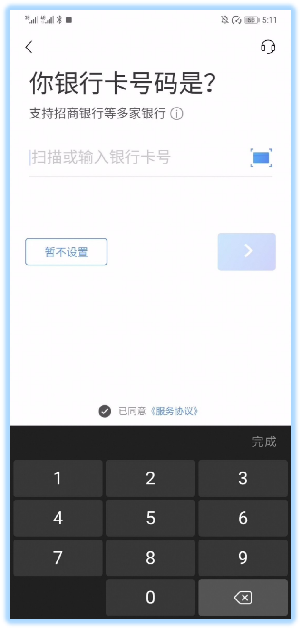 第五步:绑定本人名下任意一张银行卡,注册成功。