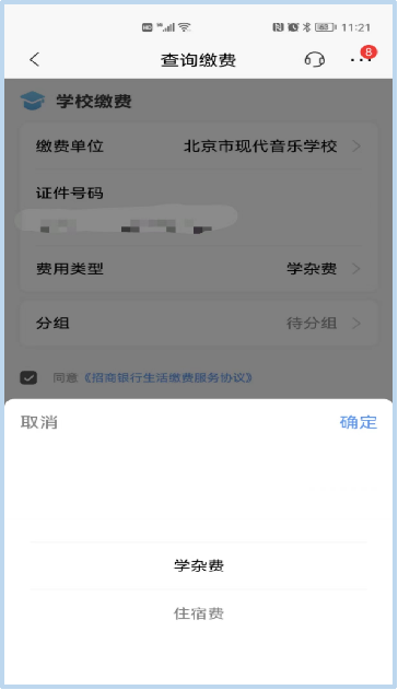 第三步:跳转招商银行App缴费界面后,输入学生身份证号,费用类型分为“学杂费、住宿费”,选择学杂费点击确认。勾选《招商银行生活缴费服务协议》,点击查询。